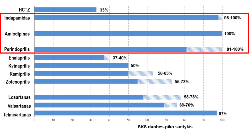 Optimali AKS kontrolė apima nuolatinį paros AKS sumažėjimą, cirkadinio ritmo išlaikymą, AKS variabiliškumo sumažinimą ir užtikrinimą, kad pacientas laikysis sudaryto gydymo plano [33]. Trumpą laiką veikiantys hipotenziniai vaistai turi būti vartojami kelis kartus per dieną ir sukelti didesnius AKS kitimus. Stebint didelį AKS variabiliškumą, geriau rinktis ilgo poveikio medikamentus (2 pav.) [34–42]. Siekiant stabilizuoti nakties ir ankstyvo ryto AKS, geriau rinktis medikamentus, pasižyminčius ilgu pusiniu eliminacijos laiku. Kai pacientui AKS kritimas stebimas naktį (dipper), vaistą vartoti rekomenduojama ryte per pusryčius. Nesant AKS kritimo naktį, vertėtų pagalvoti apie papildomą dozę ar vaistą, kuris būtų skiriamas vakare. Siekiant normalizuoti cirkadinį ritmą, hipotenzinių vaistų skyrimą galima perkelti į vakarą.